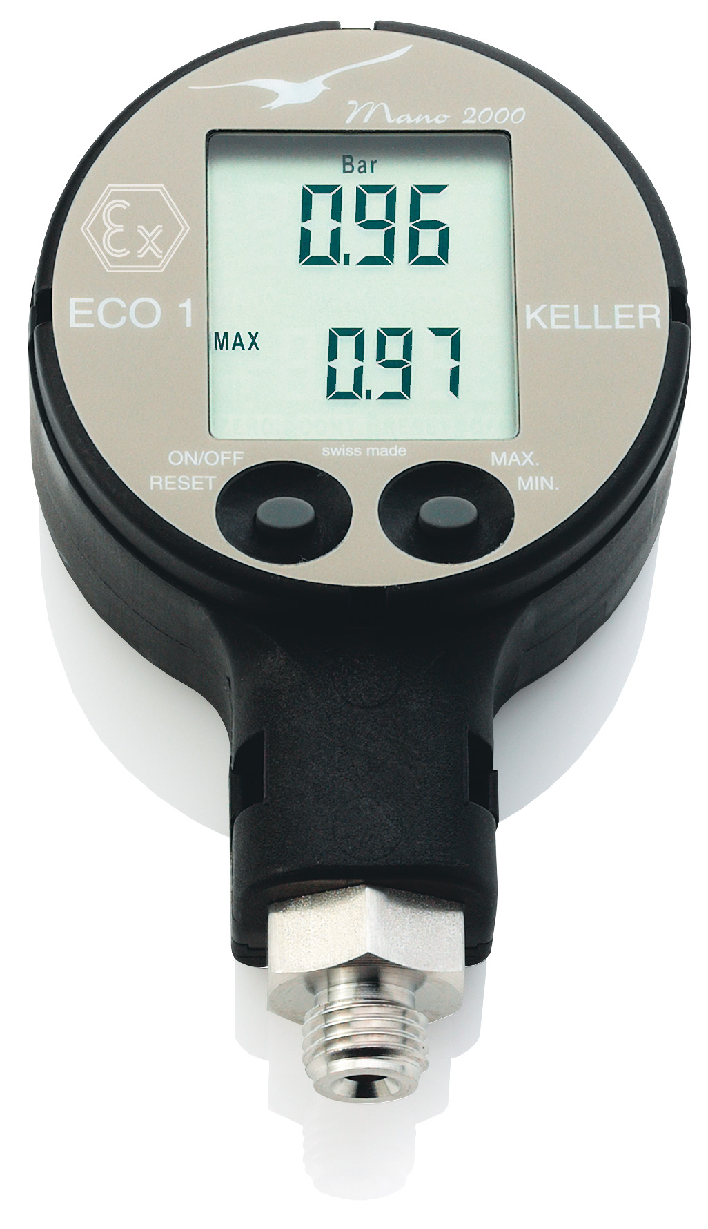 | 上海朝辉压力仪器有限公司 ECO1经济型数字压力表 型号:ECO1 一、产品概述: ECO1是一种紧凑而经济的数字压力测量仪器,它的精度始终,但有搞的分辨力和重复性。 此表每秒测压二次,并把数值显示出来。表头上方的显示表示实际压力,下方的显示自上次RESET操作后的大/小值。 表上有二个工作按钮,左按钮是接通仪表,并实现其功能,右按钮除实现其功能外,还用于转换大与小值之间的压力值。 二、特点: 大小值记录 精度:0.5%FS 三、技术规格: 范 围:-1...30bar 0...300bar 分 辨 率:10mbar 100mbar 精 度:0.5%FS 典型 1%FS大 压力连接:7/16-20UNF